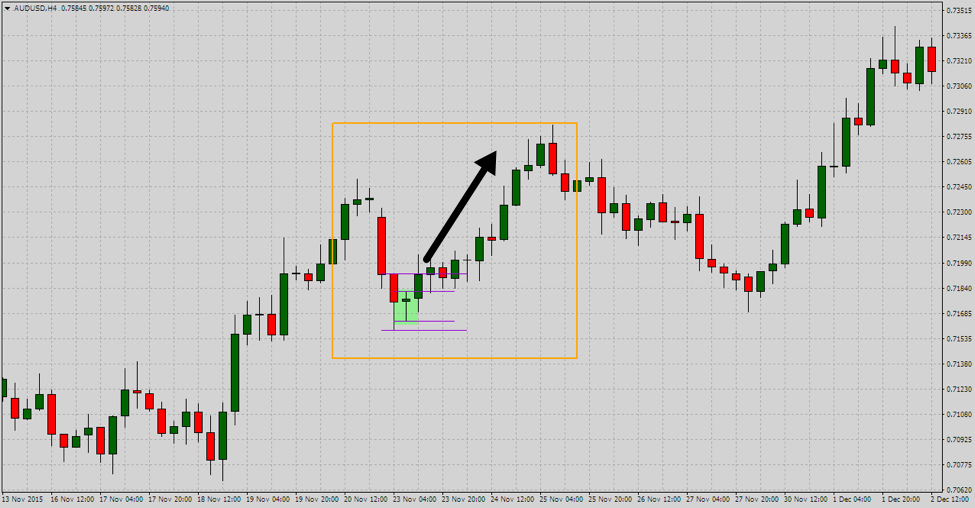 Inside bars are among the most popular candlestick patterns price action traders use in their analysis and trading. Defined as (usually) a smaller ranged bar that is totally engulfed by the bar prior to it – these are great to identify halts in momentum that can serve as a crucial cue when looking for trade setups. The general signal of an inside bar is given once price breaks out of the range of the inside bar on the next candle.
