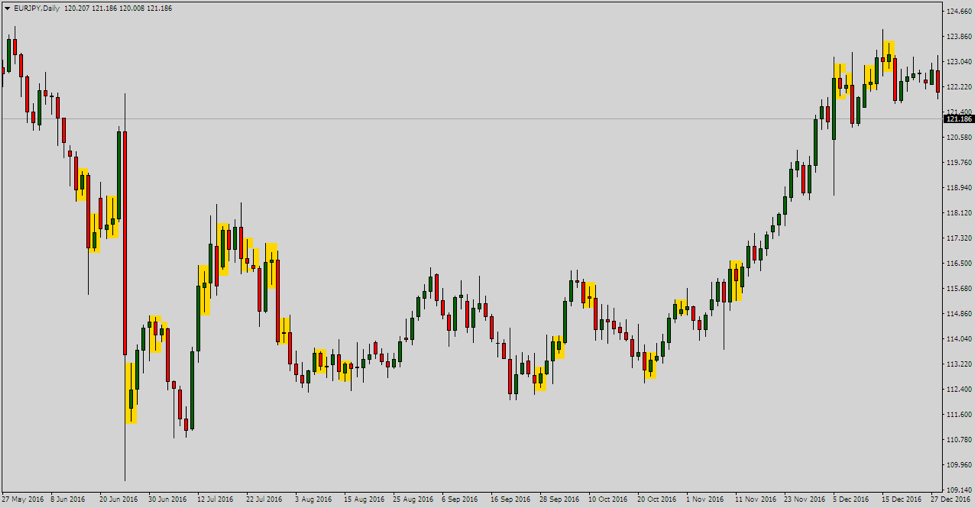On a random EUR/JPY daily chart attached below I spotted 24 inside bar setups: