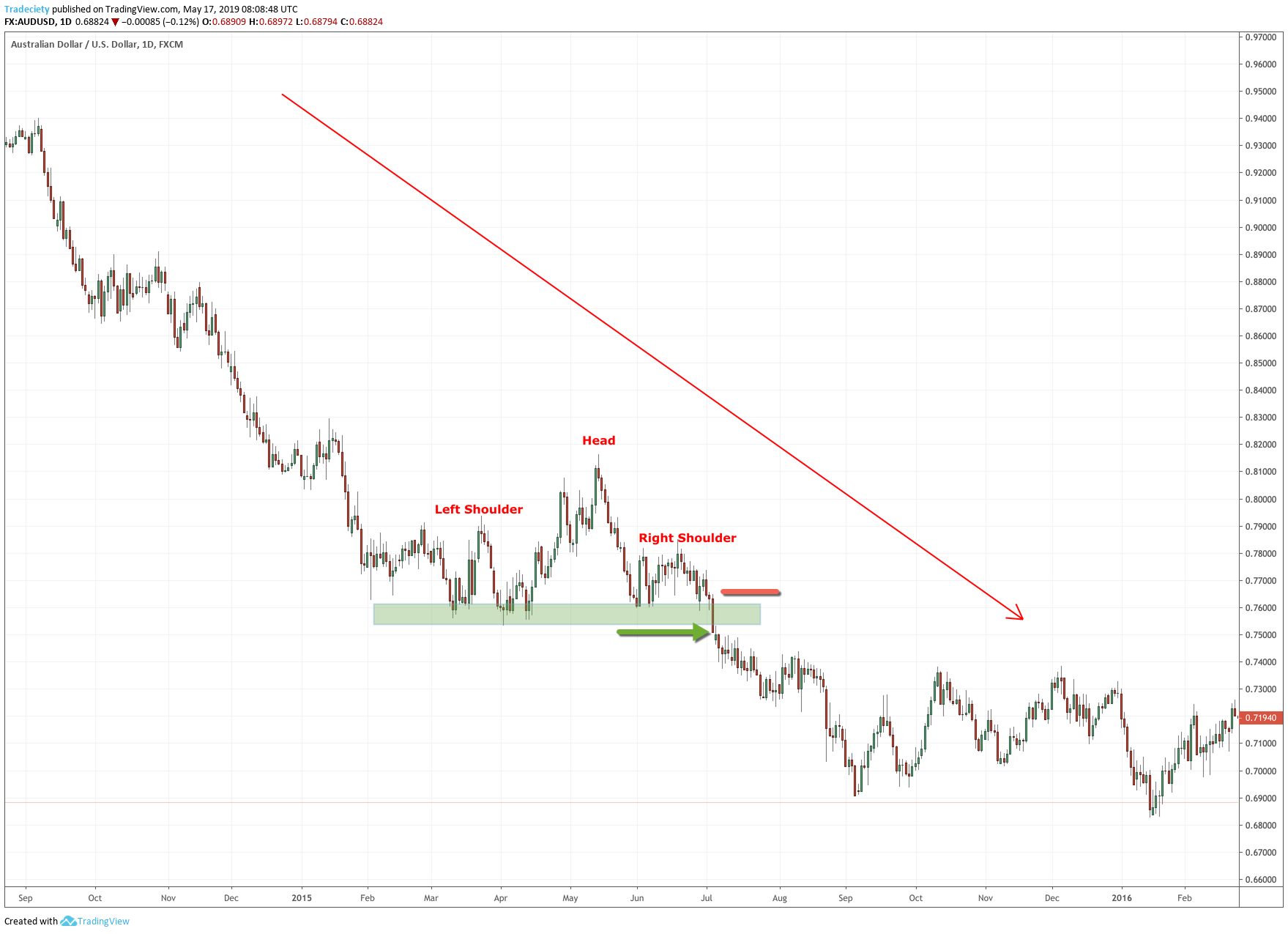 The next scenario has an even weaker head and, therefore, signals a market where the buyers have also lost the majority. The breakout happens very violently a the downtrend quickly accelerates.