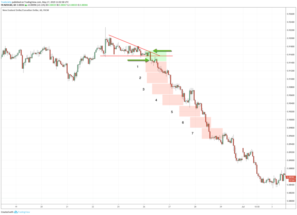 The scenario below shows a multi-top structure. The price repeatedly failed to break out higher. Then, when the price returned to the support level, the price did not break out immediately but made one small last pullback. I call this the “lower bounce” and it is a great add-on to any technical pattern. The small pullback shows that, although the buyers somehow tried to take control, the sellers stepped in right away and didn’t allow the price to rise a lot. This is a very important piece of information and can indicate a high-probability breakout.