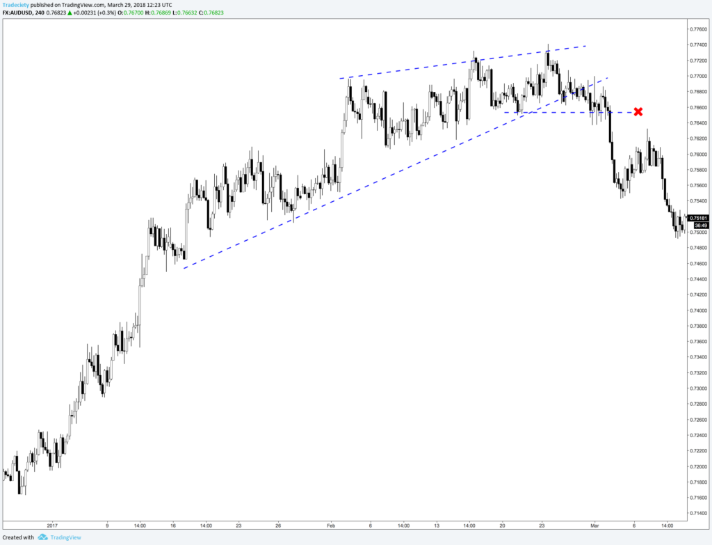 At the top of the wedge, the price barely makes a new high which is a weak bullish signal. Before the breakout (marked with an X), the market completely failed to make a new high. This is an important market tell and foreshadows the upcoming downtrend.