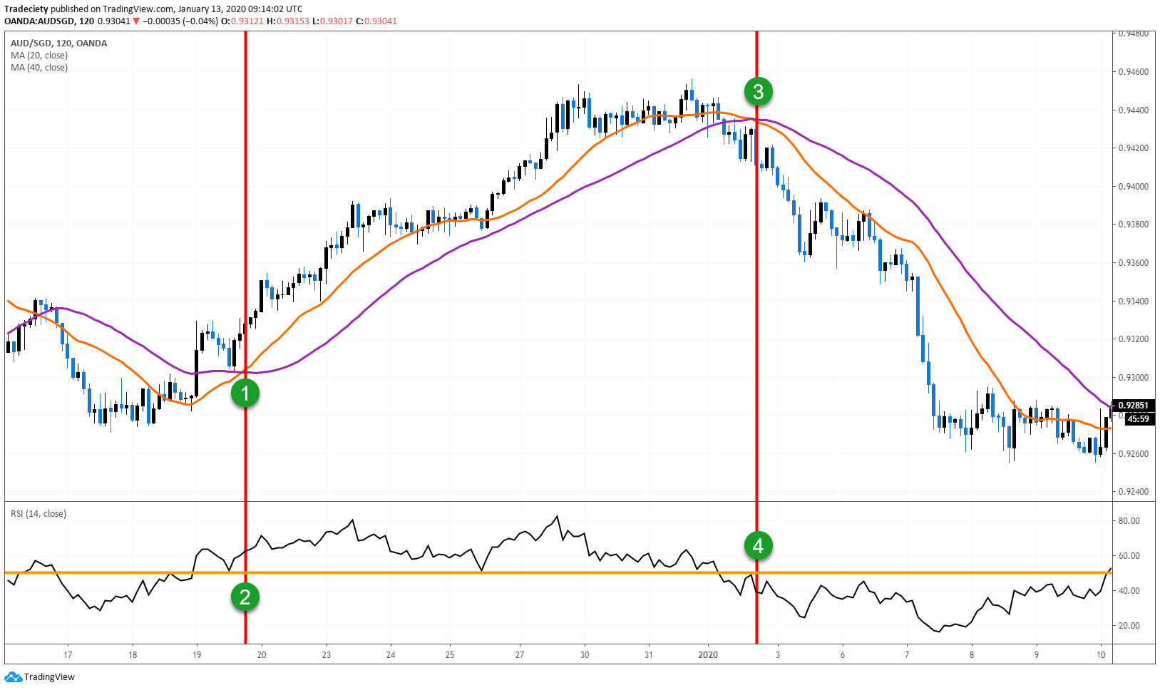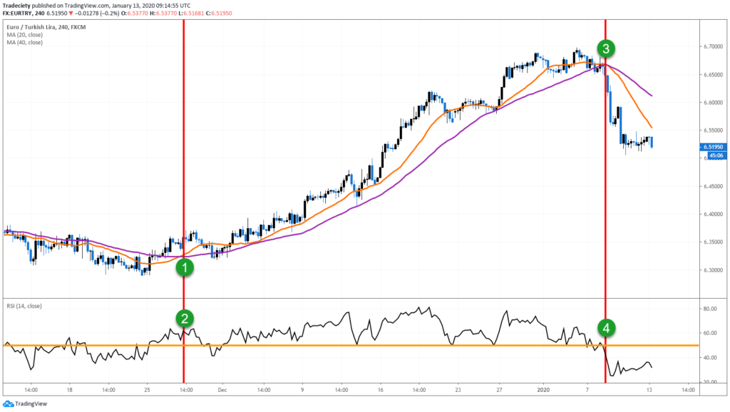 At point (1), the moving averages crossed bullish. The price was trading above the moving averages before already, but you must wait for a cross of the moving averages. When the moving averages crossed, the RSI was already above the 50 level, confirming the bullish trend signal.
