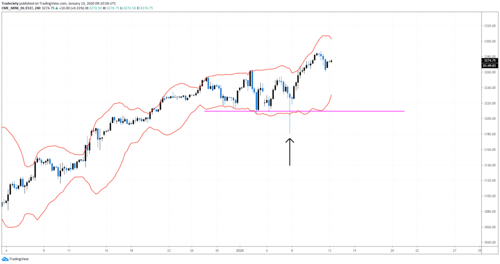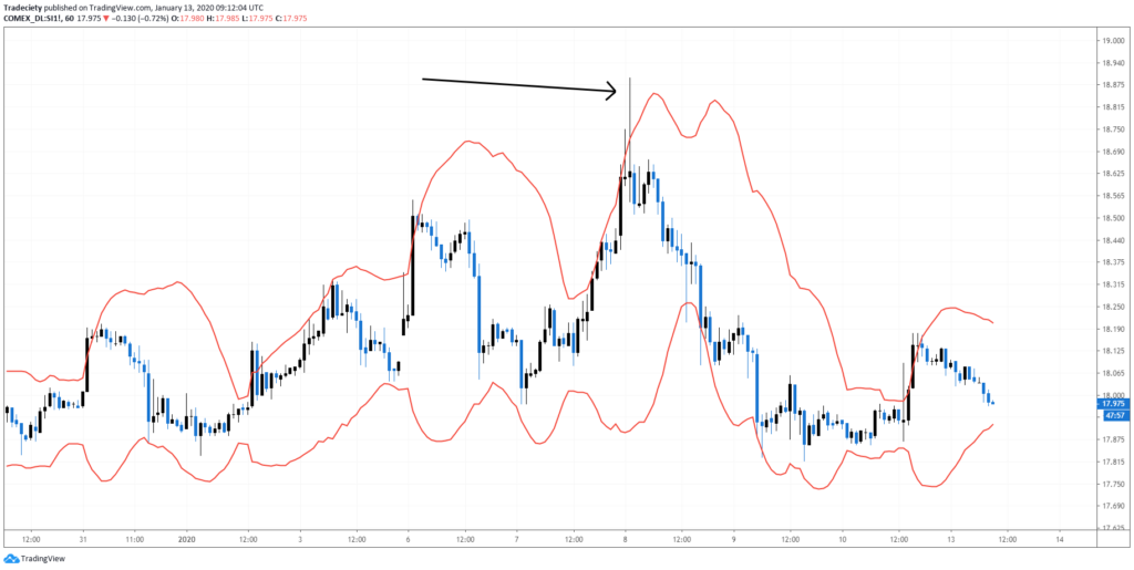 In the example below, the price made a significant spike through the upper band and immediately retracted back inside the channel. The fact that the price closed back inside the channel is another key component. During strong trends, the price will sometimes close outside or very close to the outer bands. You must avoid those situations and wait for a complete rejection.
