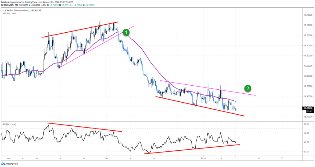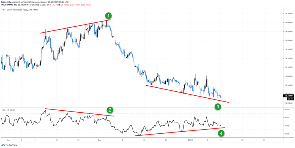 As of writing this, the price made multiple consecutive lower lows (3) and the RSI is making higher lows (4). This indicates that the trend is losing strength.