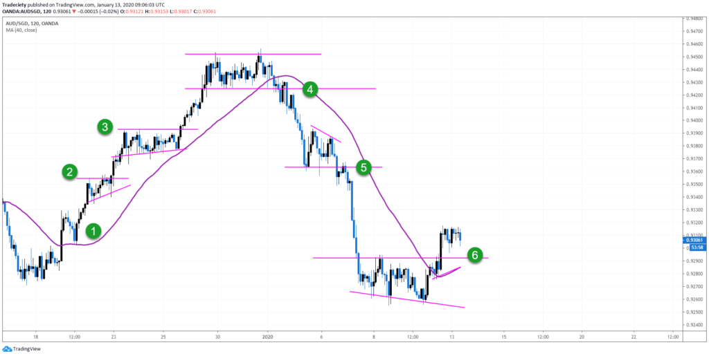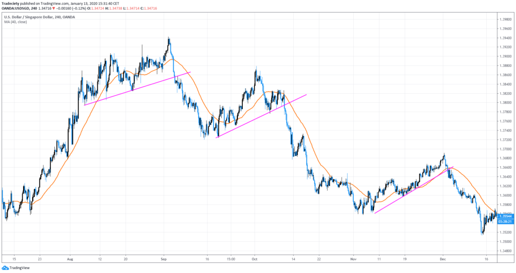 The screenshot below shows the same scenario from above but this time I added a 40-period moving average and trendlines; we will discuss trendlines as strategy 5 in this article.