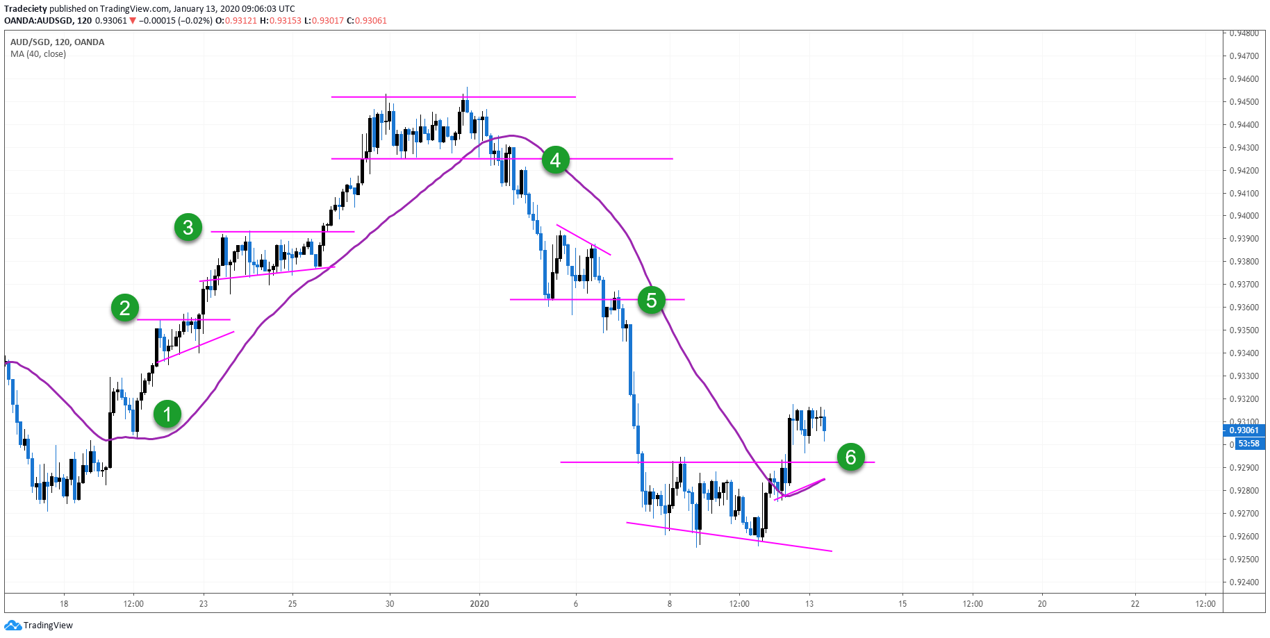 At point (6), the market made a bottom pattern with a horizontal resistance level and the breakout happened simultaneously with the cross of the moving average.