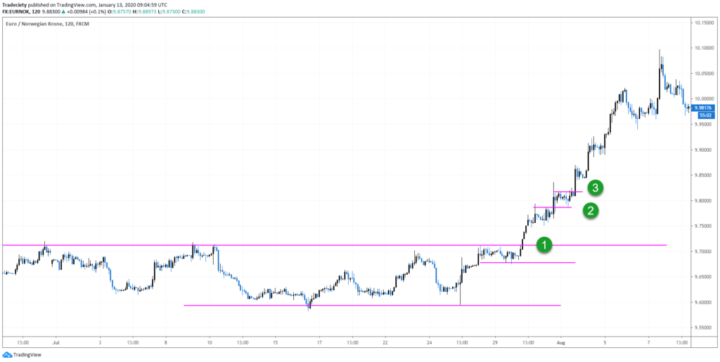 Once the price has broken out of the sideways range, a trader would wait for short consolidations that allow you to draw horizontal levels at the top. Points (2) and (3) are great examples here. Such consolidation phases are often used to time trend-following entries and I talked about this in the past in my pullback-strategy guide.