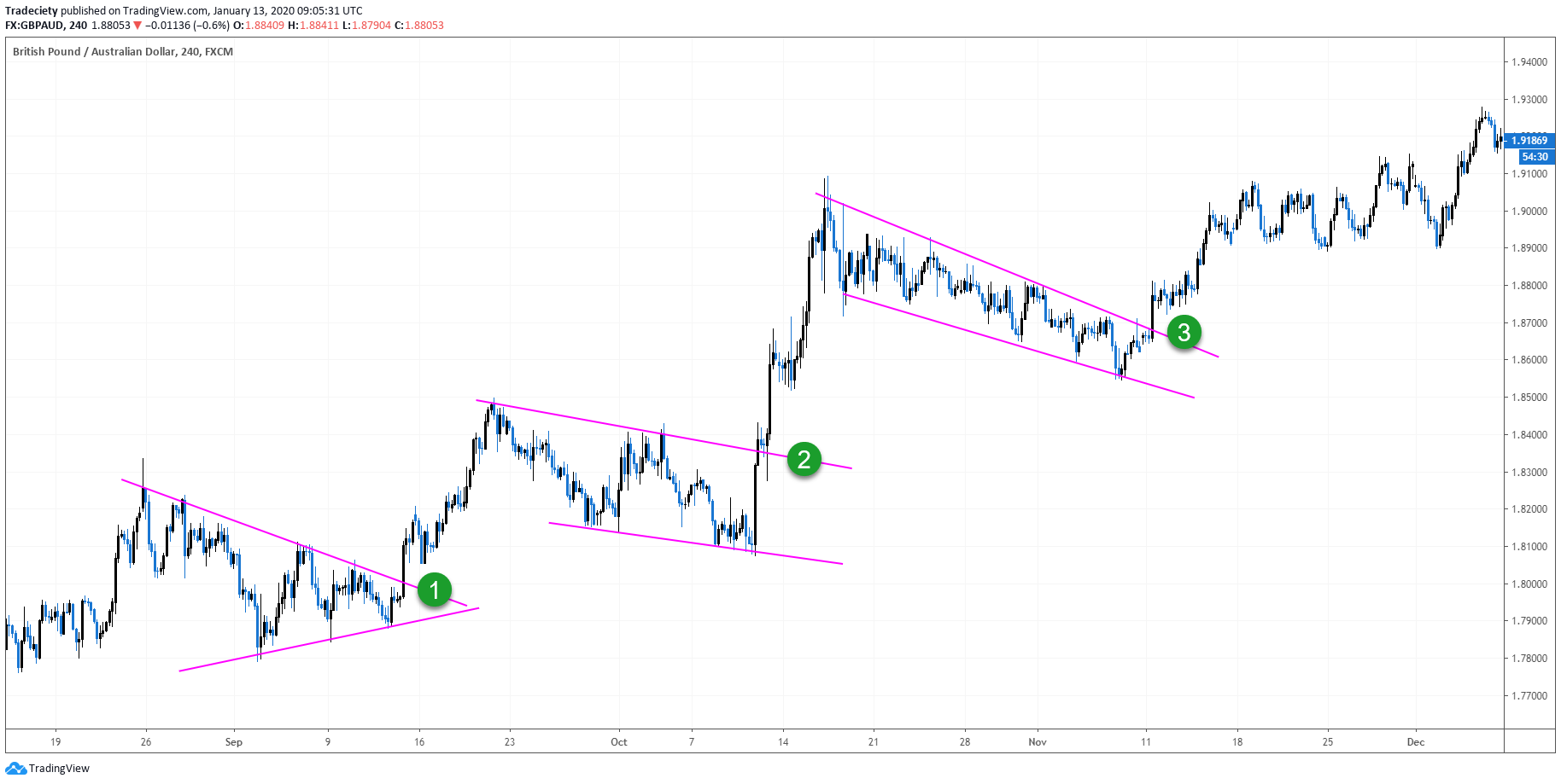 All three points in the screenshot below show such periods where the sideways consolidation was defined by a downward sloping trendline. And each time, the breakout signaled the continuation.