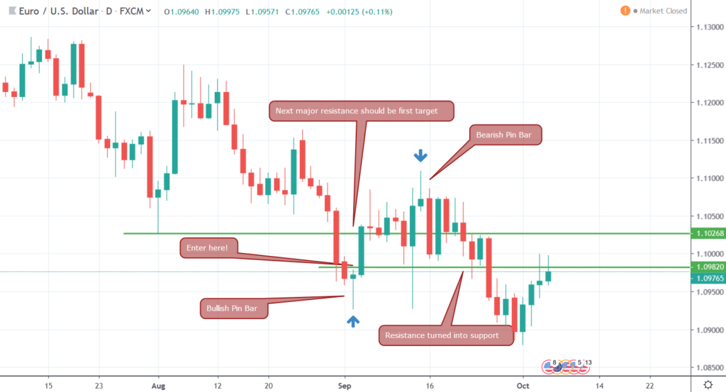 Pinbar setups are triggered once the price of the next candlestick breaks above the body of the pinbar. Once your order is triggered, you can look for next support and resistance levels to find your primary profit target. If you are a short-term trader, you can simply target a reward to risk ratio of 3:1 or any other ratio that suits you.