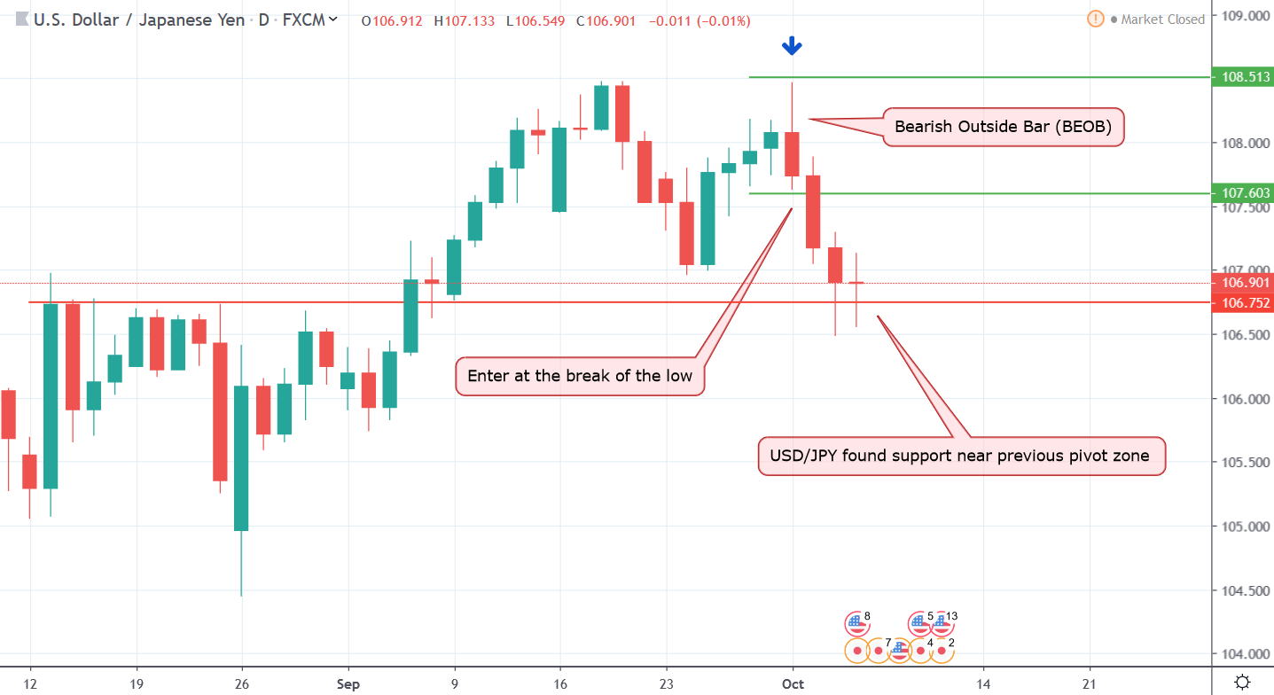 In figure 2, we can see a large bearish candlestick has engulfed the previous, smaller, bullish candlestick. By definition, it is a Bearish Outside Bar (BEOB). If you have placed a sell stop order few pips below the low of the BEOB candlestick and targeted the next pivot zone, it would have turned out to be a winning trade with a decent reward to risk ratio.