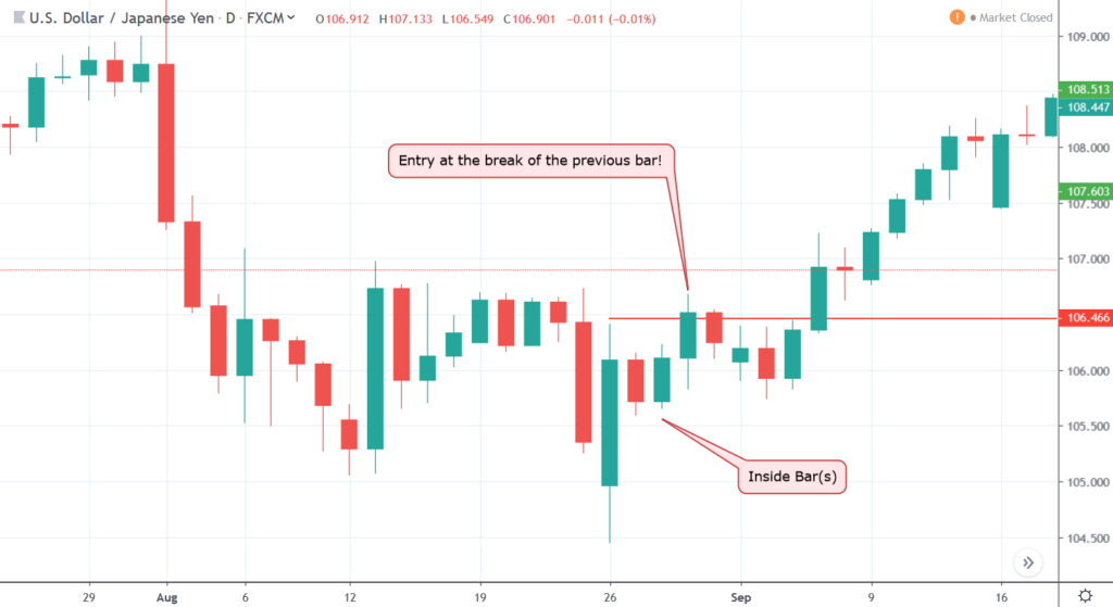 However, if you find these inside bar patterns during a strong trend, it can also signal trend continuation. In either case, you should set your stop loss above or below the mother bar. If your money management strategy requires a smaller stop loss, aggressively setting the stop loss above or below the range of inside bars can also be a good strategy. However, it is rather risky and if you are a beginner trader, sticking to set stop loss around the mother bar would be preferable.