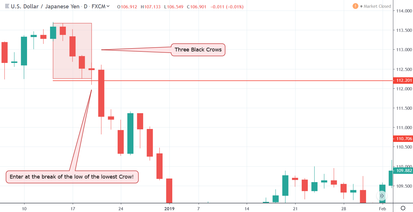 As you can see, once the asset’s price broke below the low of the lowest bearish bar, the downturn continued. Sometimes, after the low is broken, the price may retrace a bit but that is fine. You should set your stop loss above the high of the highest Crow.