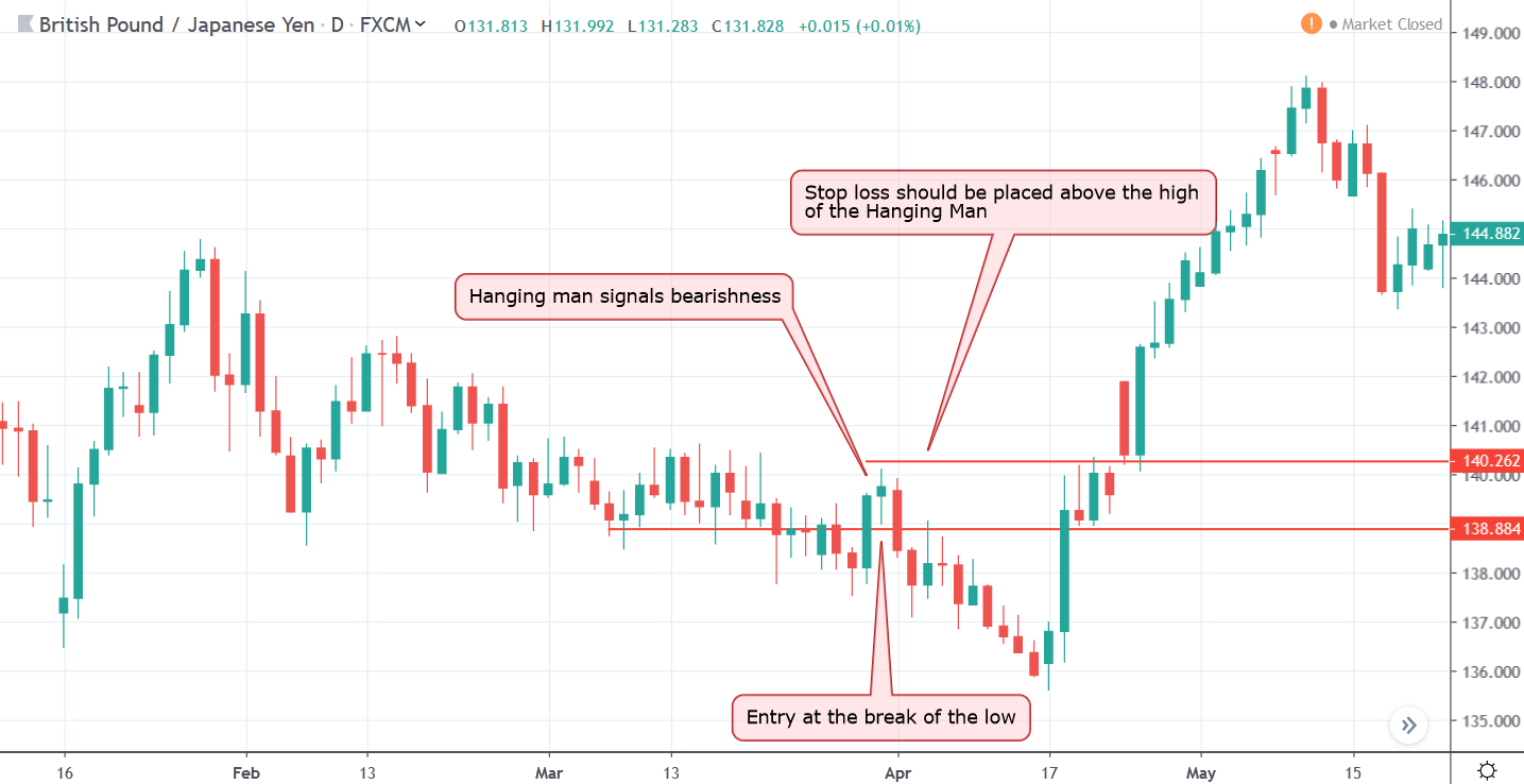 Keep in mind that Hanging Man patterns should be always considered as a bearish signal and you should not place a bullish order if the price breaks on the upside. Nonetheless, there is a similar-looking pattern that forms at the bottom of downtrend, which is called a Hammer and that signals bullishness in the market.