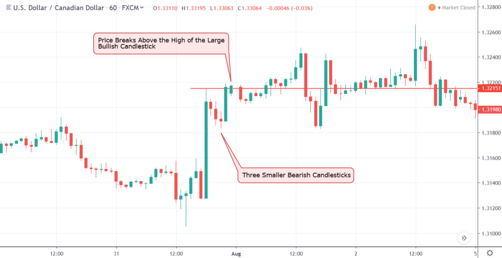 The best way to trade these patterns would be to wait for the close of the fifth candlestick, then enter with a market order. Aggressive traders may set a stop loss below the low of the third bearish bar and more conservative traders may choose to put a large stop loss below the low of the first bullish candlestick.