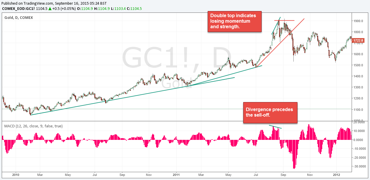 The screenshot below shows the ideal “Boom and Bust” pattern. In the initial stage you have a slow and moderate trend (green trendlines). Then, suddenly, the momentum picks up and the trend accelerates until the trendlines have a very steep angle (red trendlines). Afterwards, you usually get some kind of price action pattern (a double top and a failed breakout in this case) or your indicators turn (in the form of divergences, as we will see later) signaling the end of the boom. Finally, the bust happens and price reverses sharply.