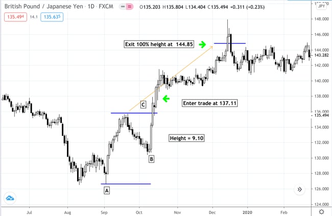 You enter a long position at the close of the breakout candle at 137.11. Since your target is 100% of the pattern height, you exit your trade at 144.85 for a profit of 7.74 to 774 pips.