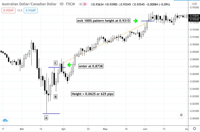 Similar to the example above, you enter the trade at the close of the breakout candle at 0.8718. You exit at 100% of the pattern at 0.9315 for a profit of 597 pips.