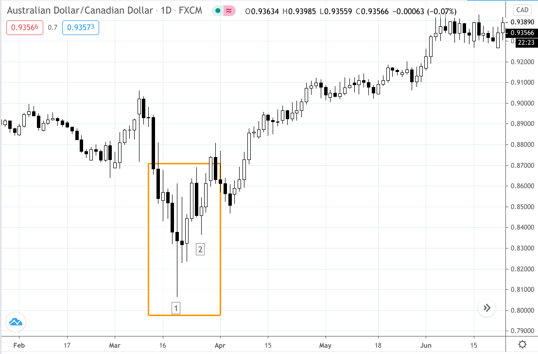 In the AUDCAD, the second low wasn’t very pronounced, and it falls between the categories of a V and W bottom. However, the second low gives you enough room to justify a trade setup.