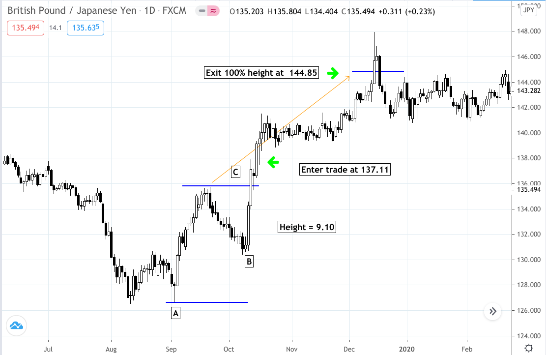 The height of the pattern between [A] and [C] = 9.10 (or 910 pips). You would add this to the top of the pattern at [C], or 135.74, to get a target of 144.85.