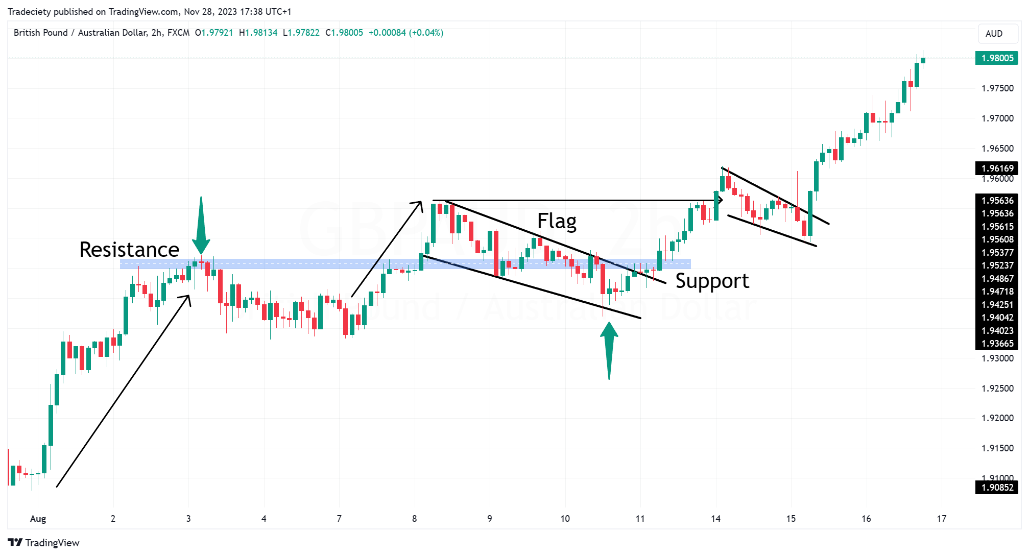 By looking at the price behavior within a flag pattern, we can often draw support and resistance zones to explain the price action better. Instead of just trading the trendline breakout, some traders may find it helpful to incorporate horizontal support and resistance concepts into their flag trading strategies.
