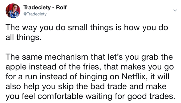 Instead of buying the chocolate, move past the candy section or get an apple. Instead of binge watching Netflix, study, read or journal your trades. Instead of drinking the 4th glass of wine, take a water and make sure that you are ready for the next day.