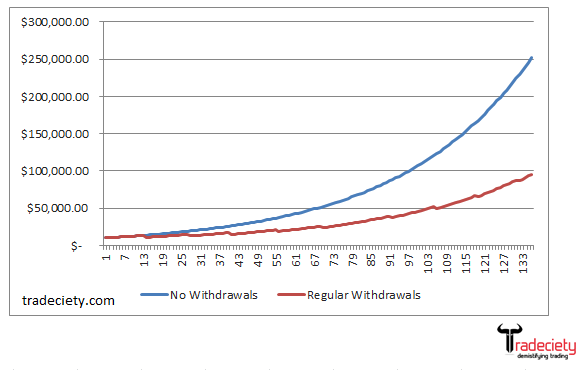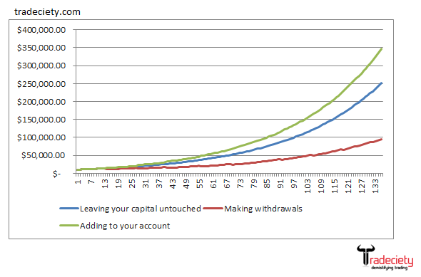 Compound interest is as close to the Holy Grail in trading as it gets, but making withdrawals minimizes the effects of compounding significantly. Leaving your trading account untouched for as long as possible and letting your capital work for you is the key to exceptional growth.