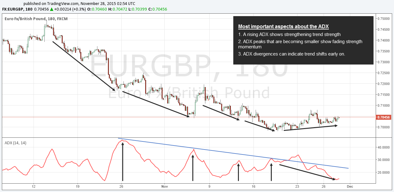The ADX measures trend strength and it is non-directional which means that it cannot tell you which direction price is going – it only tells you if the trend is gaining or losing momentum.