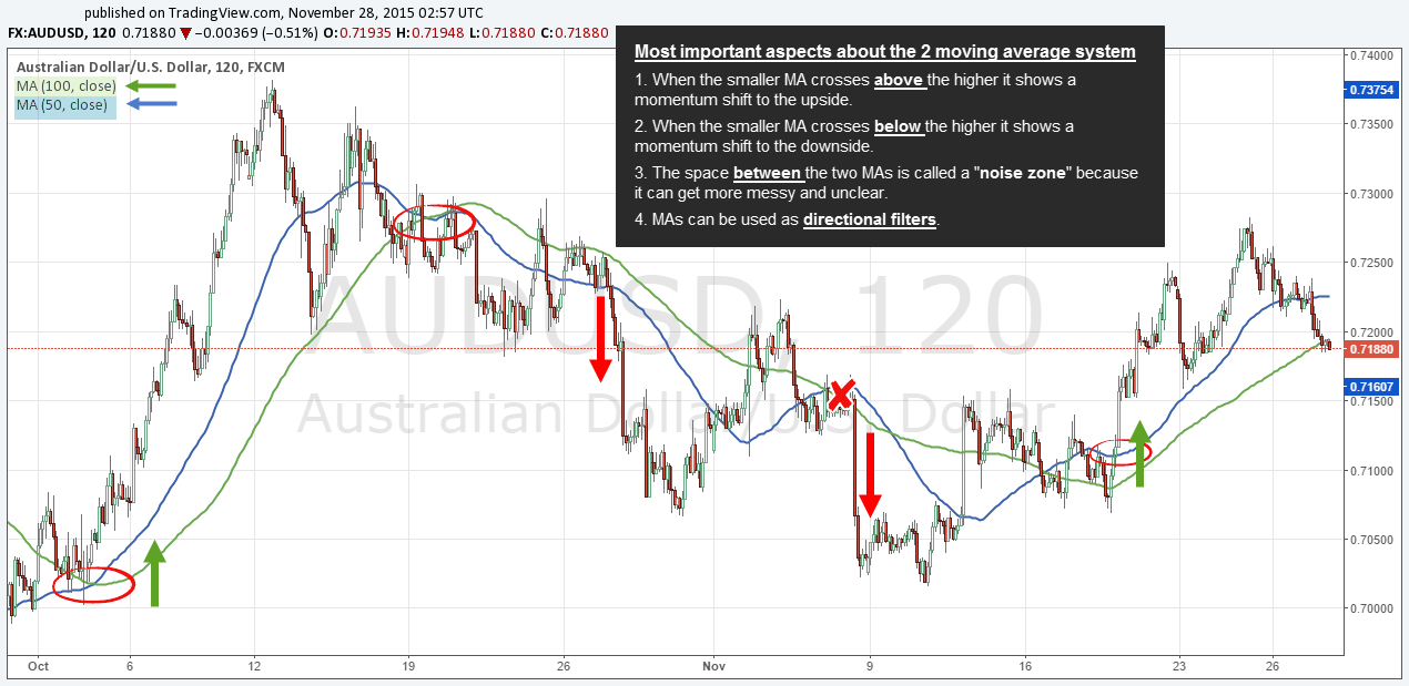 The combination of a smaller and a larger moving average measures sentiment shifts in price. The screenshot below shows a chart with a 50 and a 100 MA. When the small MA crossed above the larger MA it signaled a shift in sentiment to the upside because recent prices were moving above the average of the longer term price structure. Conversely, when the shorter MA crossed the larger MA it signaled a sentiment change to the downside because recent price started trading below the longer-term average.