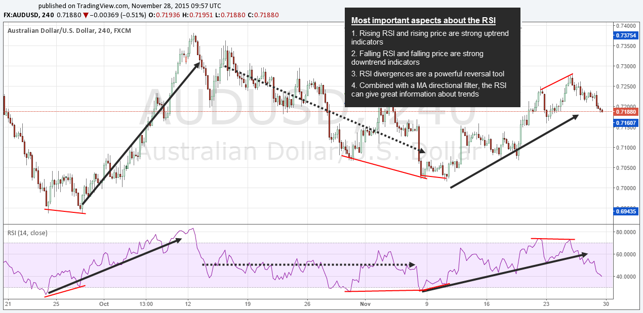 The screenshot below shows that the first uptrend was initiated by an RSI divergence (higher lows on the RSI and lower lows on price – a momentum divergence). During the following uptrend, the RSI made higher highs and higher lows. After the uptrend, price moved down for a while but not with a lot of strength and the RSI stayed mostly between 30 and 70 (dotted arrow). The next uptrend-phase also started after an RSI divergence and the RSI started making higher lows again until, just recently, another divergence signaled the end of the uptrend.