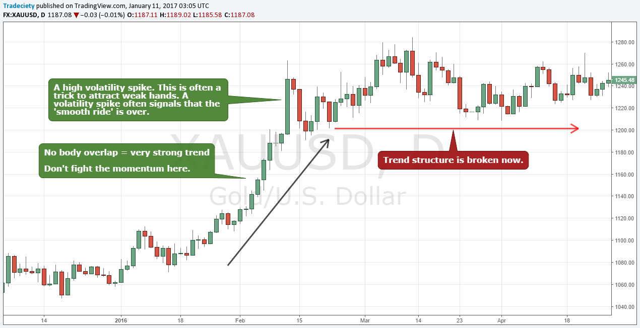 We already touched on this topic when we talked about pullbacks earlier but there are a few more things that we can use to our advantage when it comes to analyzing the dynamics between bulls and bears during trending phases. There are a few things a trader needs to be aware of when analyzing a trend and tries to estimate the strength: