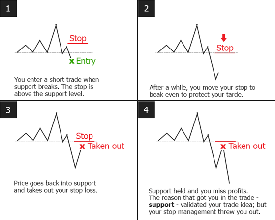 Thus, break even stops should be avoided if all you want to do is get a “risk-free” trade. Instead, move the stop behind the price at reasonable levels. Usually, natural support/resistance offer good spots for stop trailing.