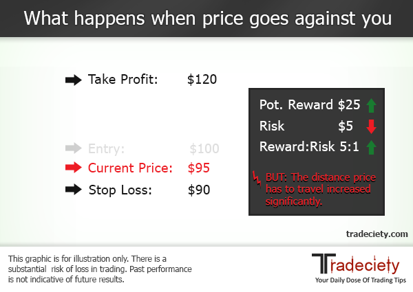 Price falls to $95 with a stop still at $90 and the take profit at $120. The reward:risk ratio is now 5:1. But, at the same time, the price has to travel much further: $25 instead of the initial $20.