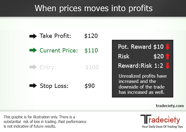 When the price is at $110, you could trail your stop to $100 with your take profit still at $120. The reward:risk ratio increases to 1:1.