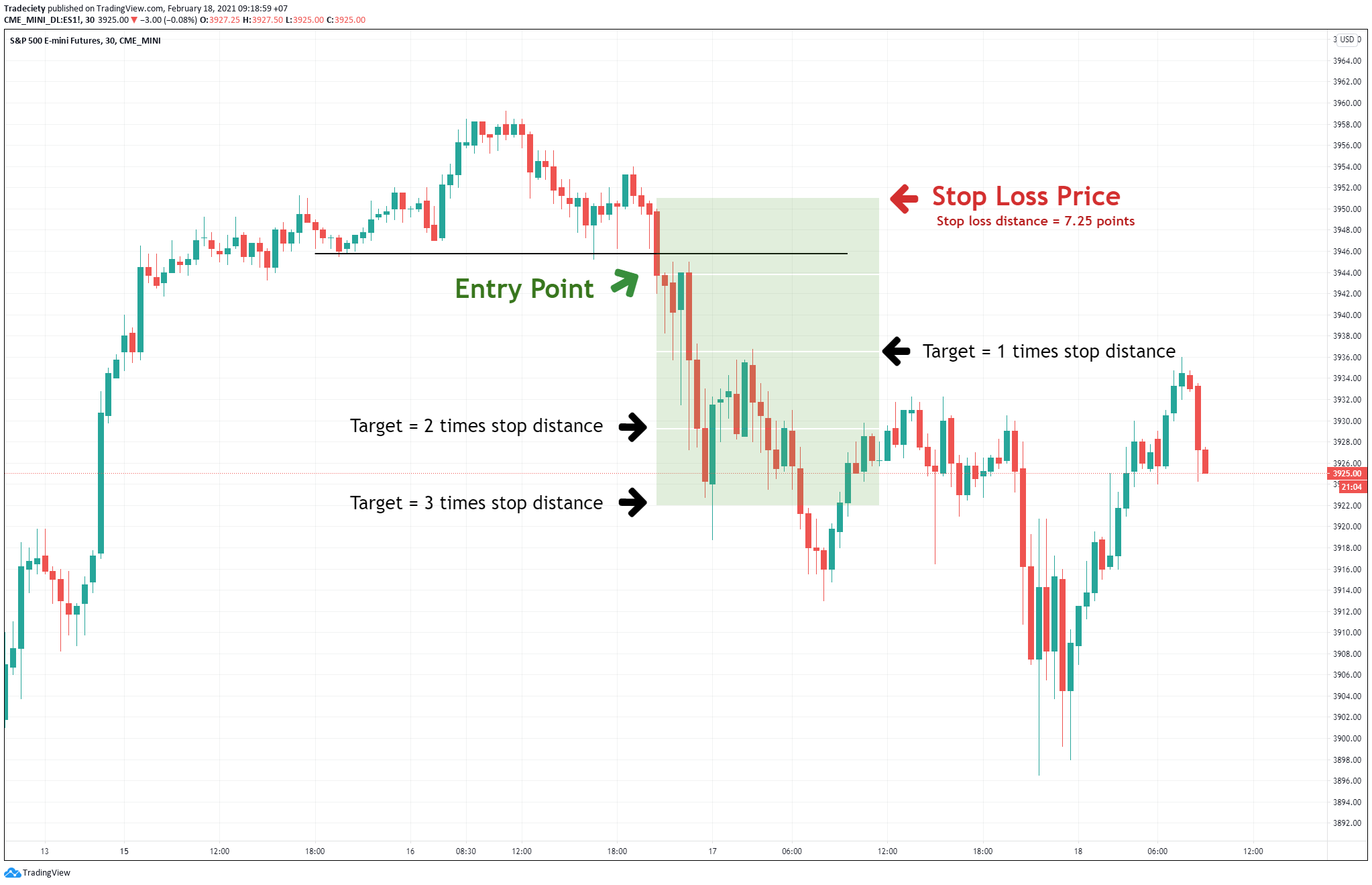 Generally, traders look left to find the most recent important support or resistance level and then place the target a few points above it. This is important. In the example below, you want to place the target a few points above the support level in case of a short trade because it will mitigate some of the risks that price action could bounce off the level.