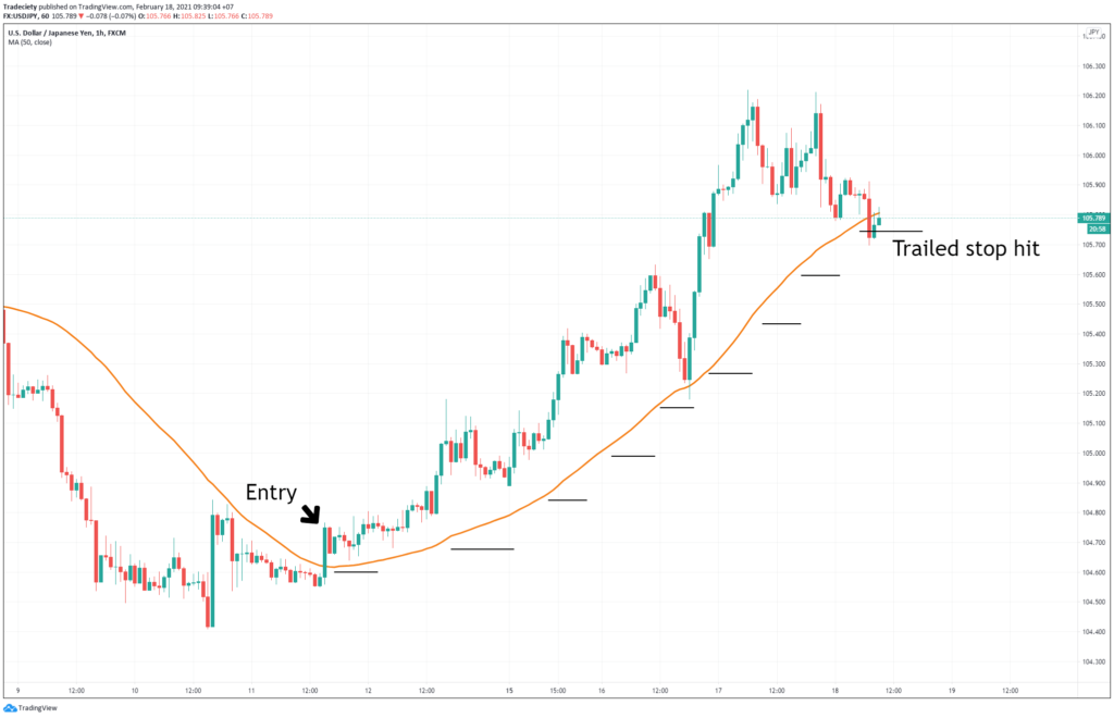 Usually, traders choose moving averages as their tools for stop loss trailing. In the example below, I used a 50 period moving average and the trader would trail the stop loss behind the moving average. And never RIGHT at the moving average to avoid getting kicked out during regular pullbacks.