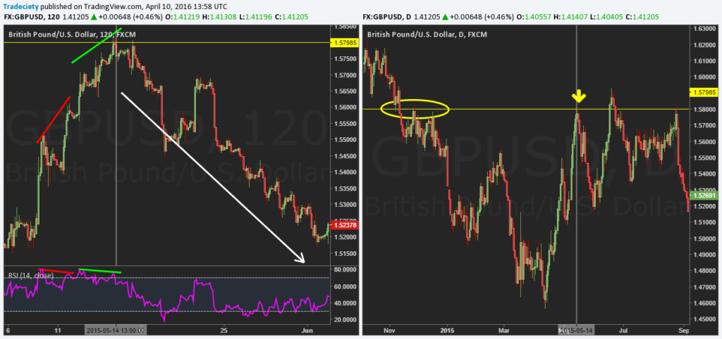 The screenshot below is a great example: On the left side, you see an uptrend with two divergences. However, the first one completely failed and the second one resulted in a massive winner. What was the difference? When we take a look at the higher time frame on the right we see that the first divergences happened in the middle of nowhere and the second divergence formed at a very important resistance level (yellow line and yellow arrow). As a trader, you first identify your support/resistance zones and then let price come to you. Such an approach will impact your performance in a big way.