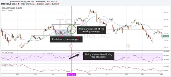 The screenshot below shows an uptrend of Tesla. First, it’s important to see that the consolidation happened after a pullback, but it never made a lower low. It even tested the prior highs as support – clue number one.