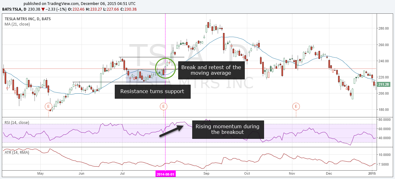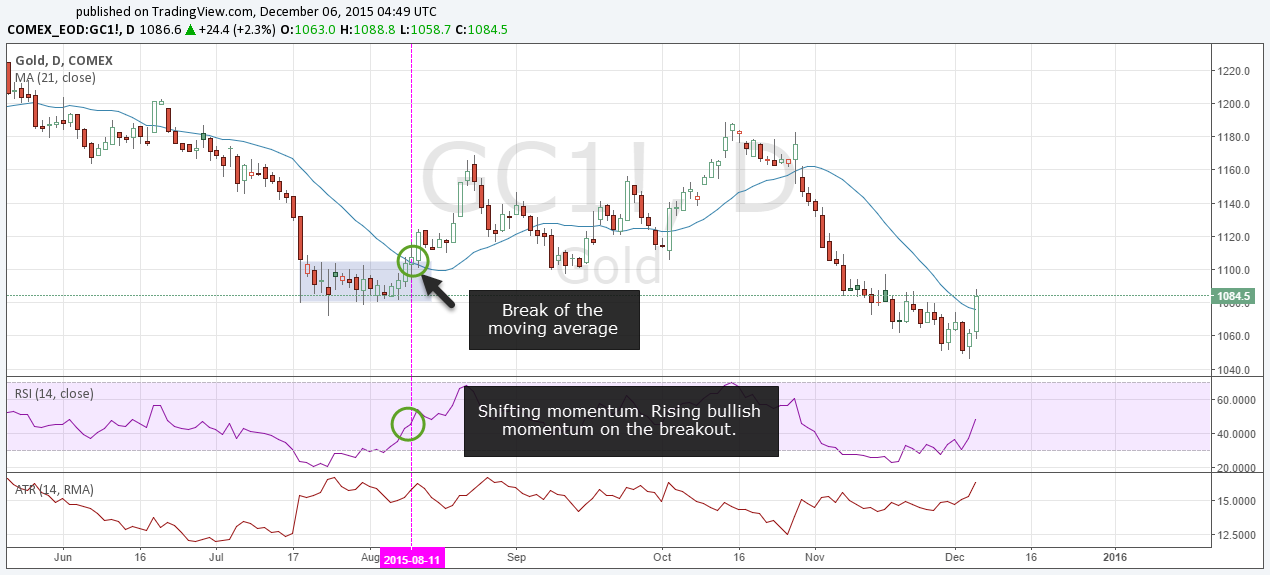 The break of the moving average was a Doji candle and price closed above the moving average afterward; clue number three. There was a little consolidation after the large bullish candle, but price never moved against the breakout.