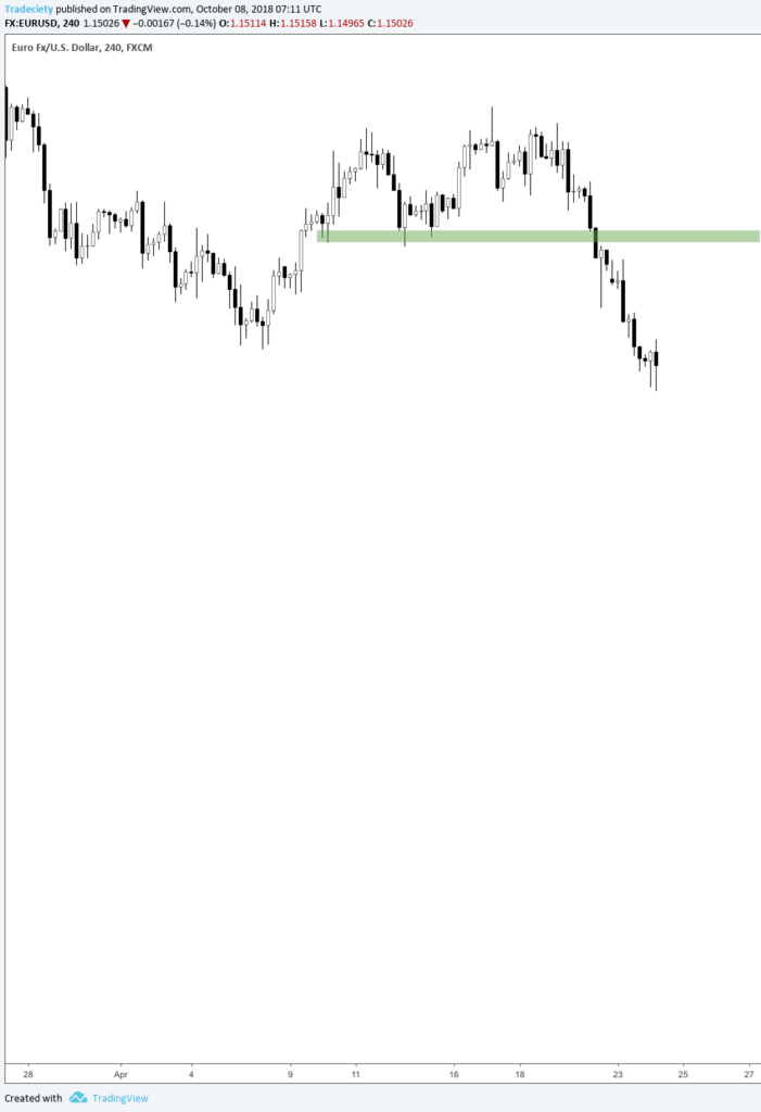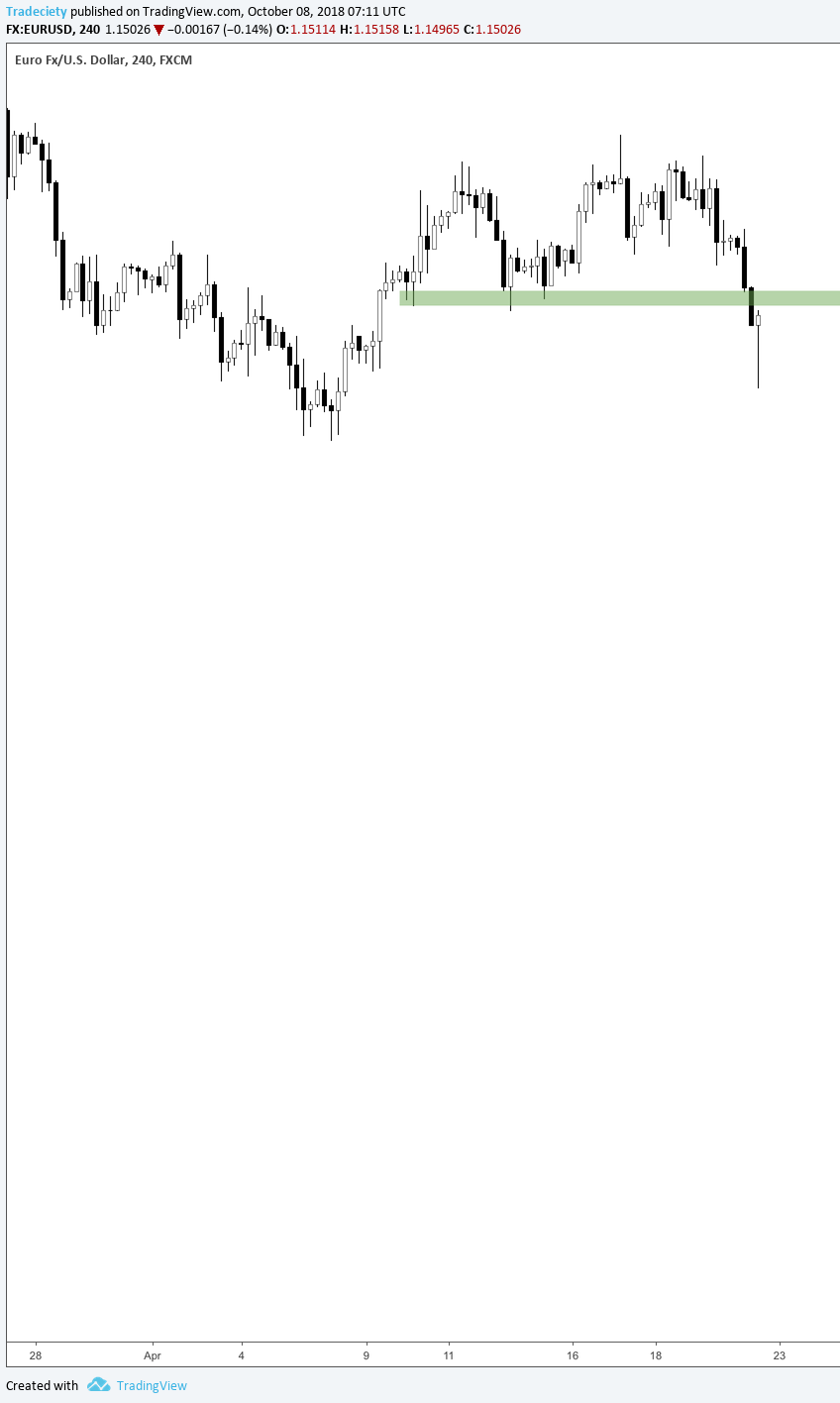 And that’s exactly what happened. The last candle in the screenshot below shows another scenario many retail traders get wrong. We see a large bearish candle with a wick. The amateur will only see the wick and get pushed out of their trade because they fail to interpret the size in the right context. The body shows strong selling pressure and the wick is compared relatively small. Size and the relation of wicks and bodies can also be a very important building block for your understanding of technical analysis and I wrote about it here: understand any candlestick pattern