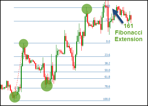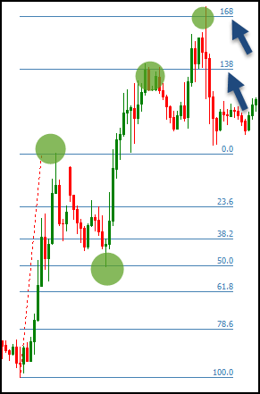 A 50, 61.8 or 78.6 retracement will often go to the 161 Fibonacci extension after breaking through the 0%-level. A 38.2 retracement will often come to a halt at the 138 Fibonacci extension. The screenshots below show the Fibonacci moves from the beginning and this time we applied the extensions to the price moves. As you can see, the extensions provided great places for take profit orders.