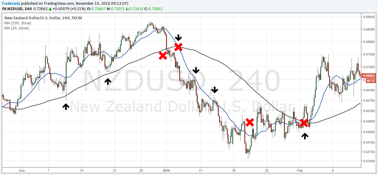 With this example, it becomes obvious that the optimal length of a moving average depends on the trend and the strength of the trend. Using 2 different moving averages can be helpful here.