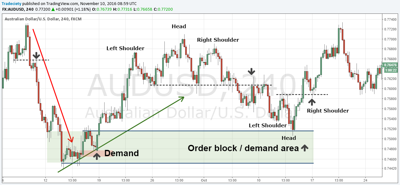 The screenshot below shows a larger range market with different wave types and scenarios. On the left we start with a strong downtrend (red arrow). When price failed to put in a lower low, it also created a demand zone. The downtrend transitioned into a rally after price started to make higher highs (green arrow) – remember point 1. The rally slowly ended with a larger Head and Shoulders pattern – which is a classic wave pattern – followed by a short-term downtrend. The downtrend after the Head and Shoulders ended once price dipped in the order block (or call it demand area) and found new buying interest. At the same time, the transitioning pattern at the order block was a Head and Shoulders again and waves slowly turned towards making higher highs.