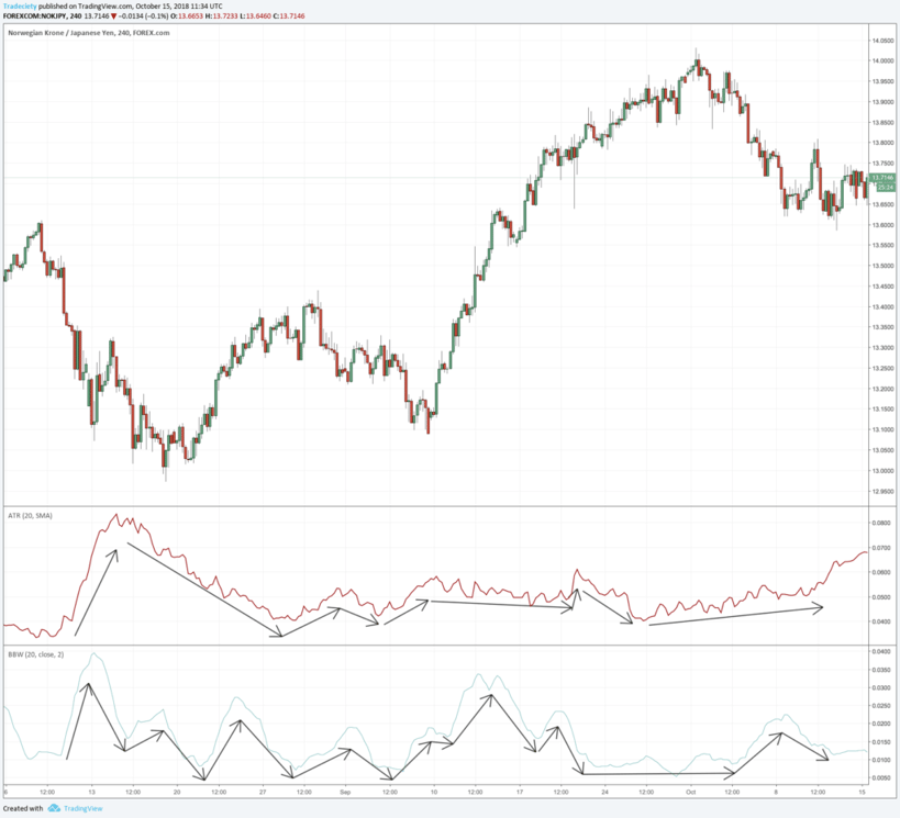 Upon close inspection, it seems like the general directional output seems to be much smoother for the ATR, though. The Bollinger Band® width often changes directions and, thus, indicates a change in market conditions more frequently. The ATR indicator rarely changes the direction completely.