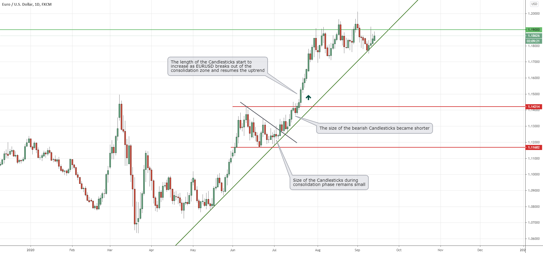 If you observe any candlestick chart carefully, you will find that during a trend, the length or size of the candlesticks starts to gradually increase compared to the timeframe when it was in the consolidation phase. During an uptrend, like the example chart in figure 1, we can see the size of the Candlesticks remains relatively small during the consolidation phase on the EURUSD’s daily timeframe. However, as soon as it breaks above the resistance and the uptrend resumes, the length of the bullish (Green) Candlesticks starts to increase.
