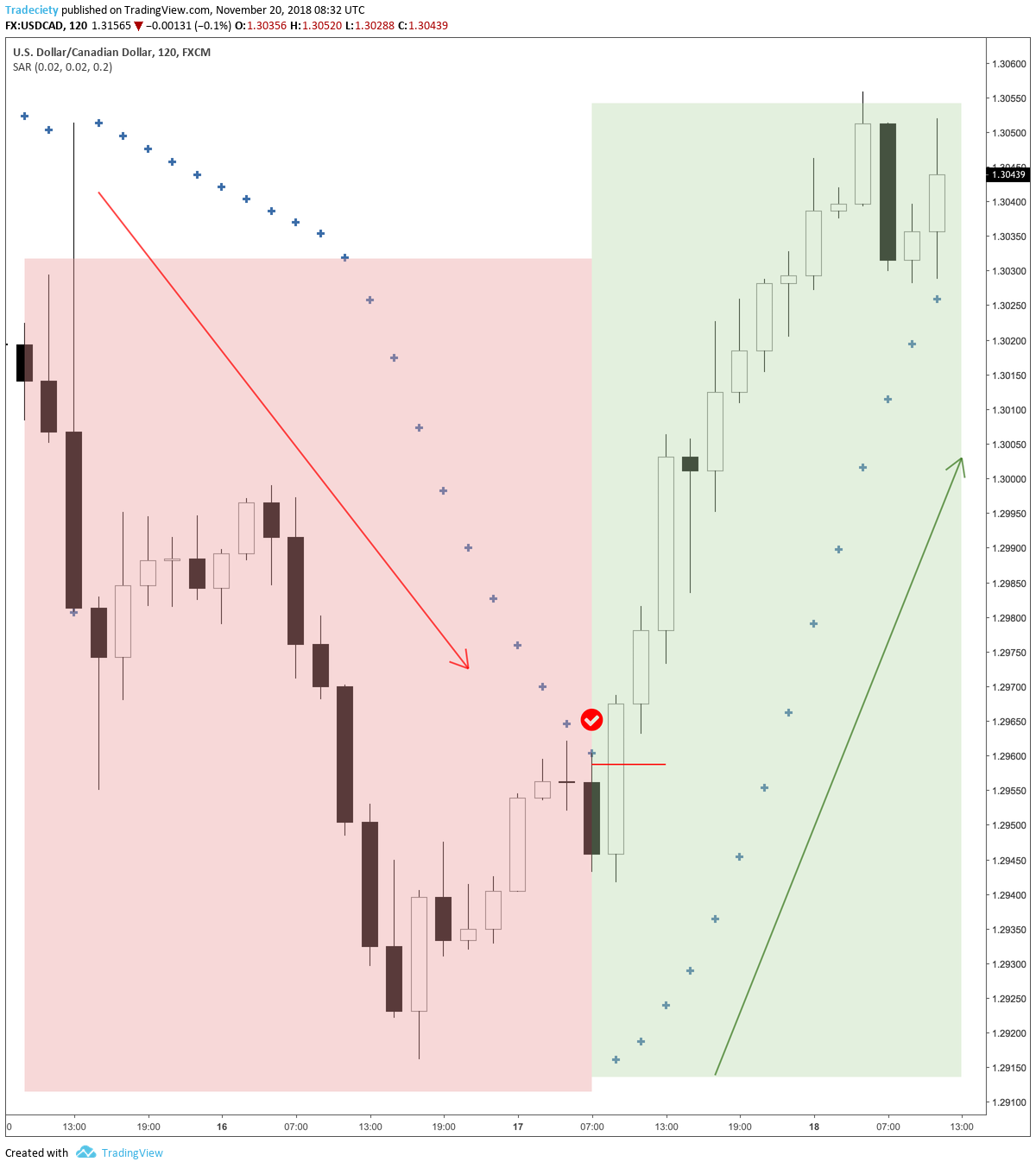 The screenshot below shows those basics effectively and during the downtrend on the left, the SAR dots were above the price, acting as a trailing stop. The candle marked when the red checkmark highlights the candle where price, for the first time, hit the SAR. When the price hits the SAR, it would lead to a stop hit, and the SAR signals a change in direction.
