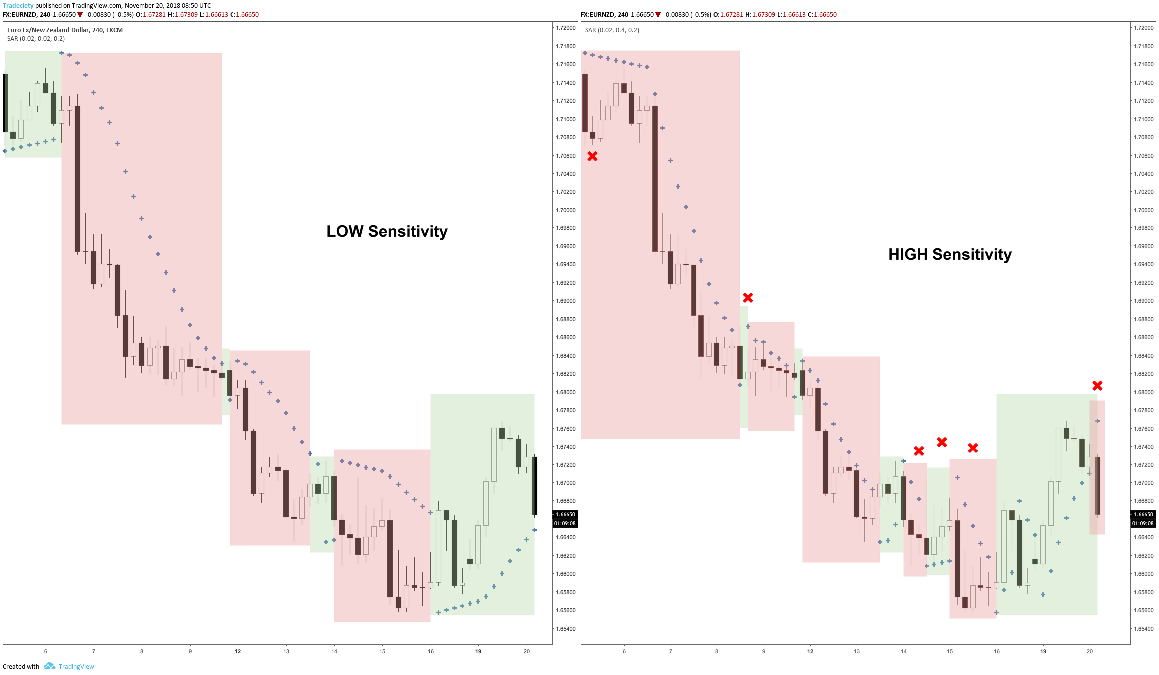 Let’s compare how sensitivity impacts the SAR signals. On the left, we see the default setting of 0.2 for the increment. On the right, I set the increment to 0.4. We can see right away that the SAR on the right is giving more signals and whereas on the left the indicator seems to be smoother, the high sensitivity jumps around a lot. However, we can also see that on the most right candlestick, the price is falling rapidly and whereas the low sensitivity SAR still signals a long trade, the high sensitivity already signaled a change in direction.