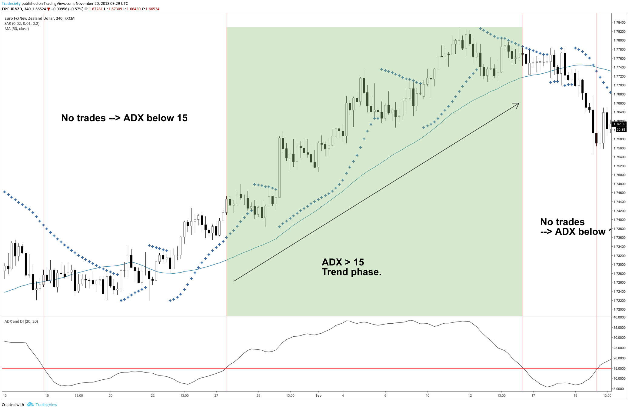 In the screenshot below, there is one trending phase where the ADX is above 15. During this phase, the price is above the moving average. Thus, the trader will stay aside in all other market conditions and only look for potential long entries as long as the price is in the green marked area.