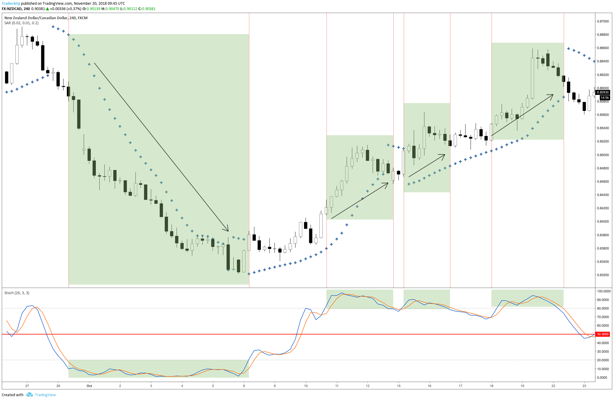 In the screenshot below you can see how precise the STOCHASTIC seems to signal trend markets. First, the STOCHASTIC confirms a long downtrend when it dips below 20 and stays there for an extended period. The SAR stop only got hit when the STOCHASTIC also rose above 20.