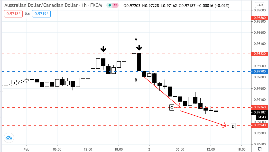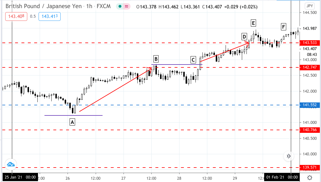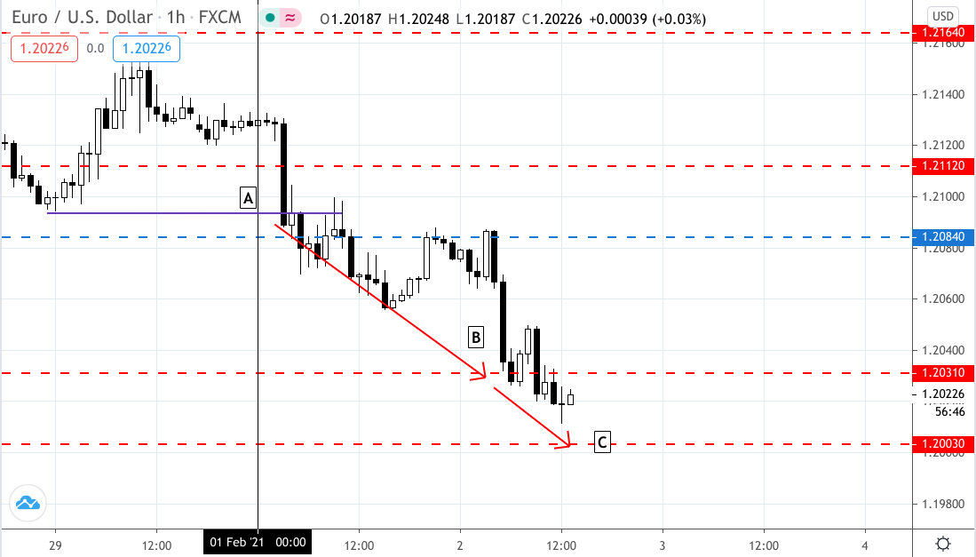 A breakout toward the downside occurred at [A]. Clearly, the momentum was bearish and the Euro appears to be rapidly declining against the USD. A trader who opened two positions might use [B] at S1 as the first target and [C] at S2 as the second position.