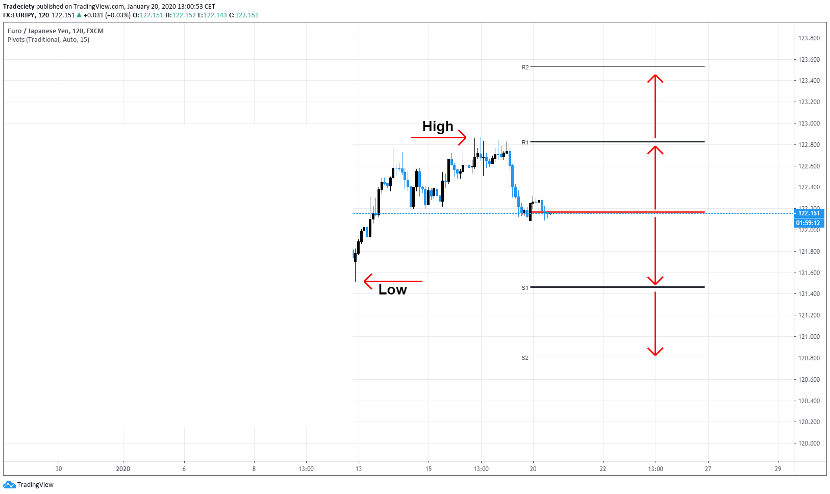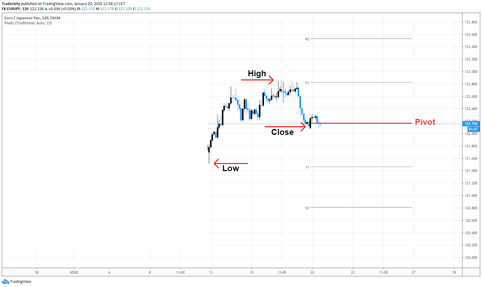 In the screenshot below, I marked the High, the Low and the Close of the previous week’s price action. The resulting Pivot Point (red line) is the average of those 3 price levels.